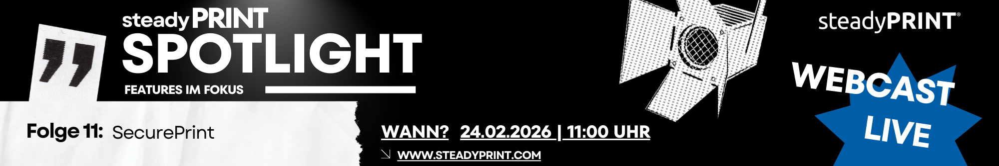 Wir laden Sie herzlich zur 11. Folge unserer Webcast-Reihe „steadyPRINT Spotlight – Features im Fokus“ am 24.02.2026 um 11:00 Uhr ein. Diesmal dreht sich alles um das Thema „SecurePrint„.